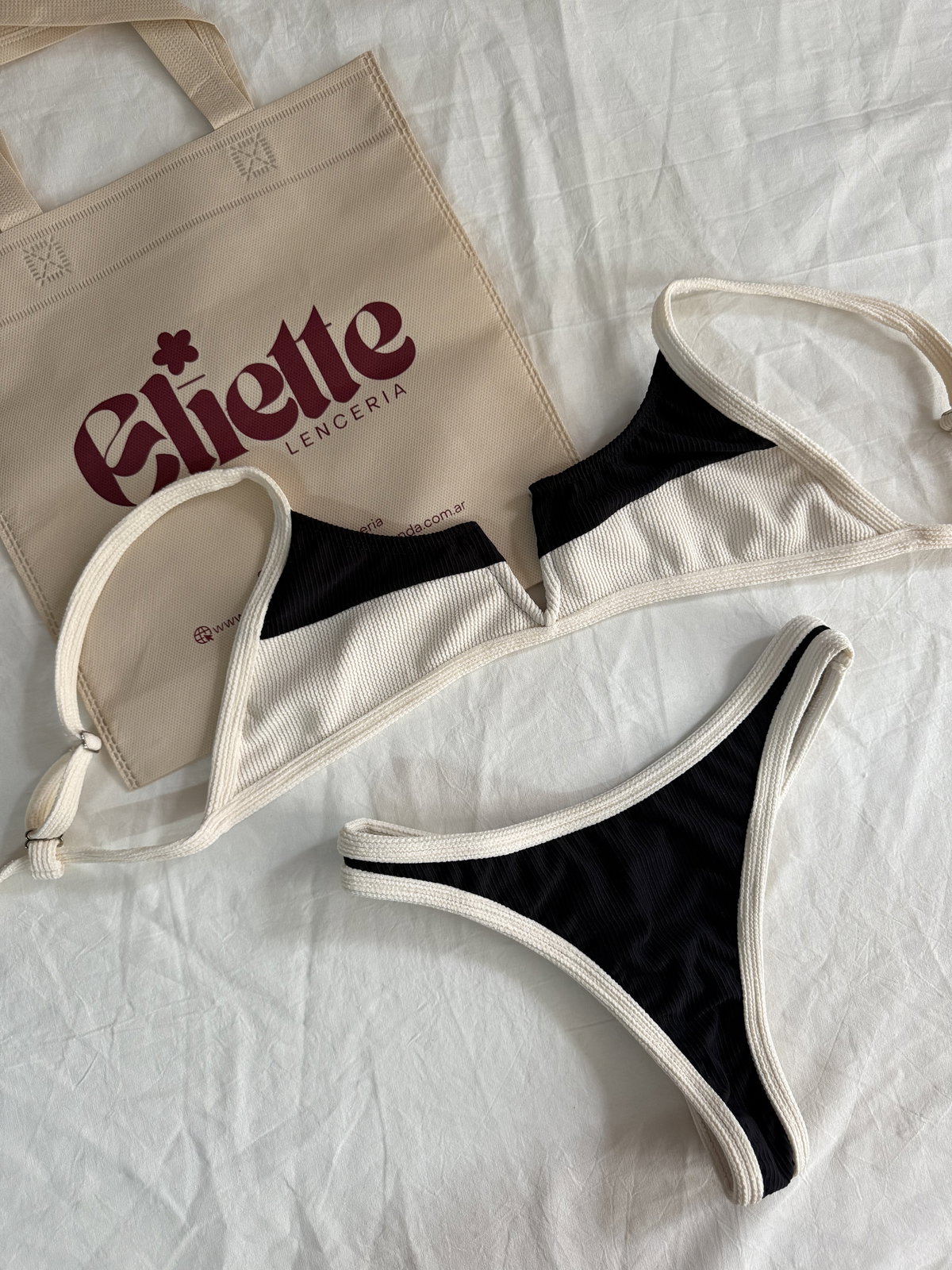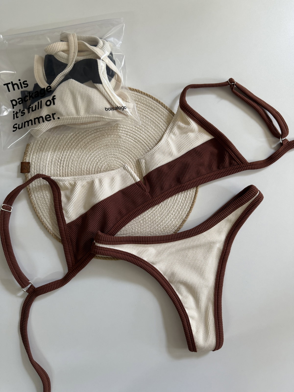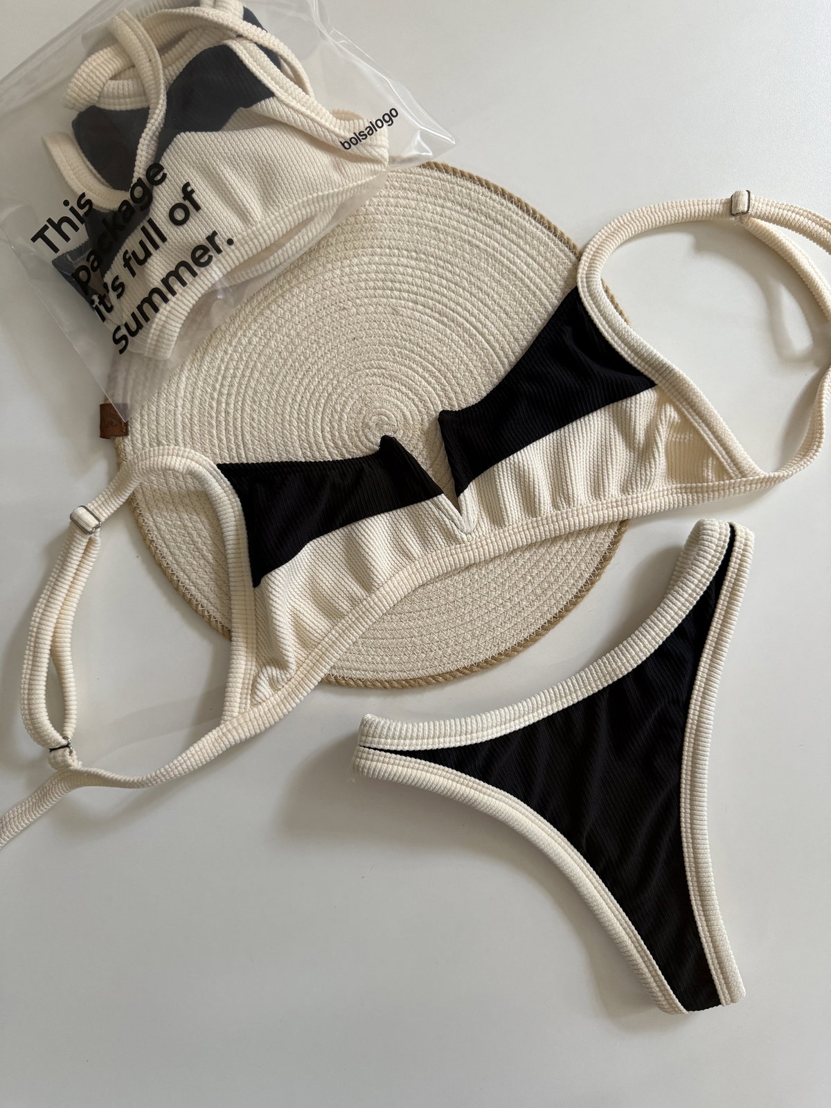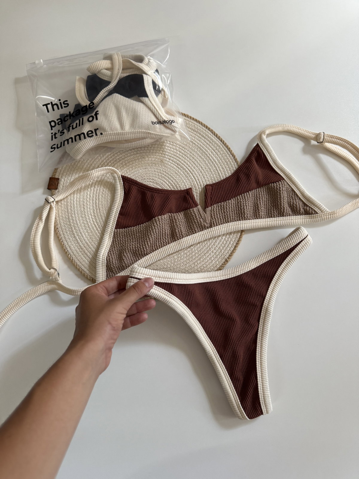 Bikini texturada combinada corte V ,tiras regusbles , Bombis entera colaless