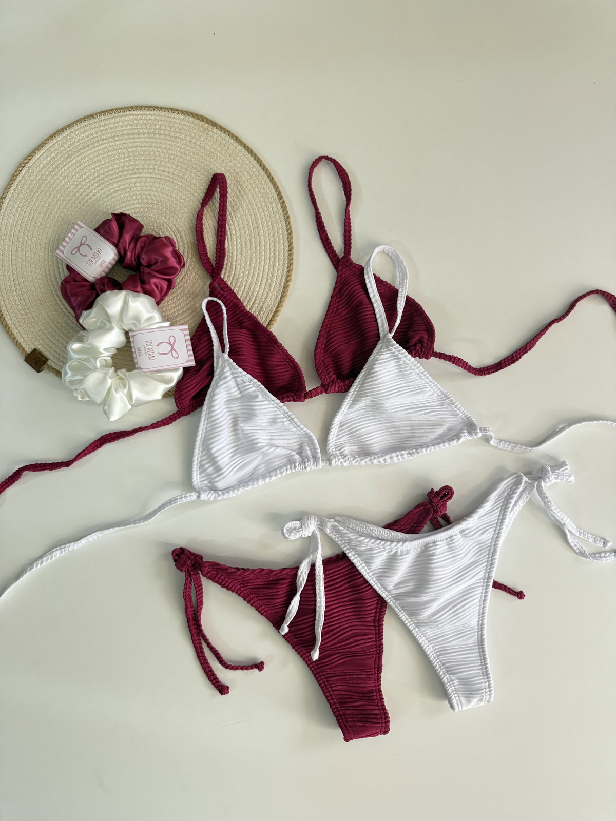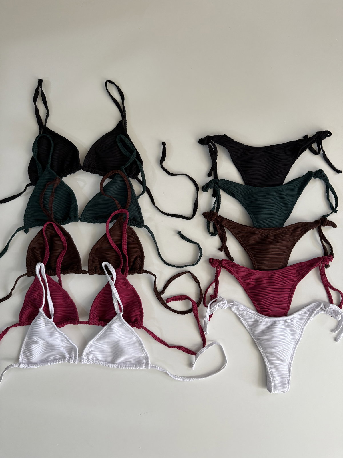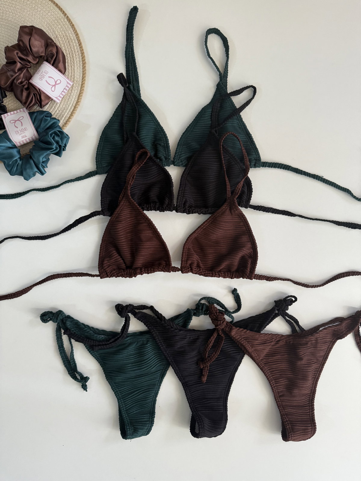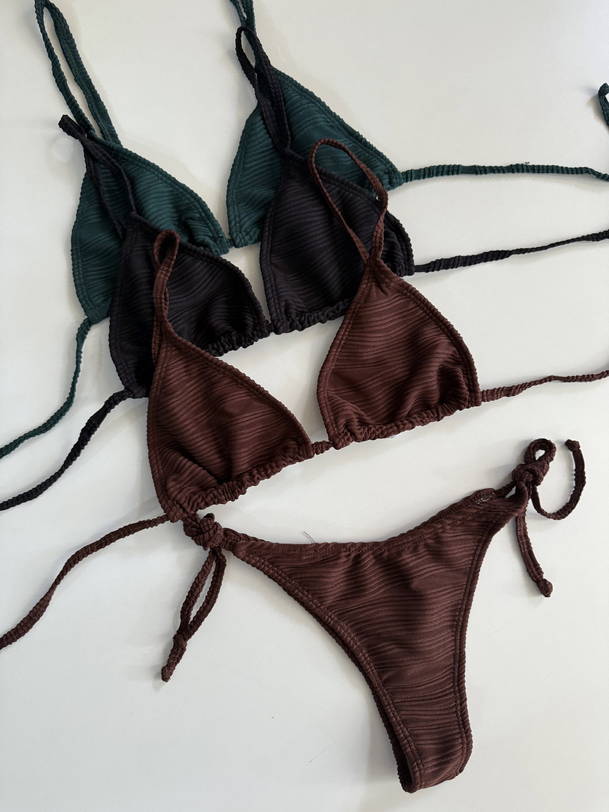 Bikini texturada triángulo para atar , se le puede poner tazas. Bombis para atar